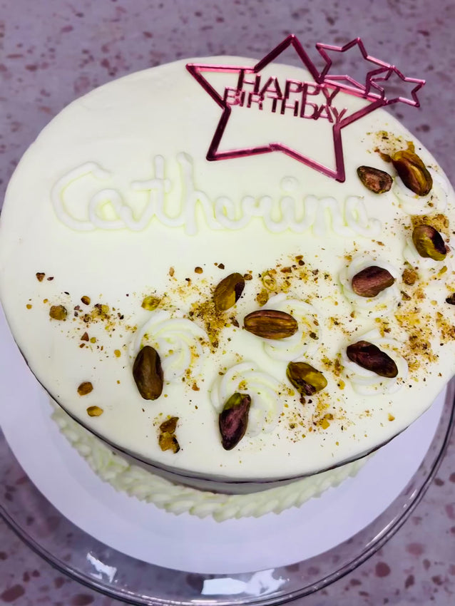 Indulge in the delicate balance of nutty elegance and fruity delight with our Pistachio Cake. This luscious creation features a light and fluffy pistachio sponge, frosted with a rich cream cheese buttercream that melts in your mouth. The pièce de résistance? A decadent blackberry coulis filling that adds a burst of sweet and tangy flavor, making every bite a tantalizing treat.